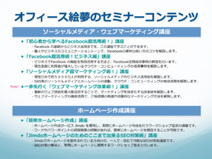 オフィース絵夢では、セミナーの出張講師も承っております。 企業様やコミュニティ様からオファーをいただいておりまして、現在可能なコンテンツは、画像の内容となっておりますが、カスタマイズすることも可能です。 出張講師の詳細は […]